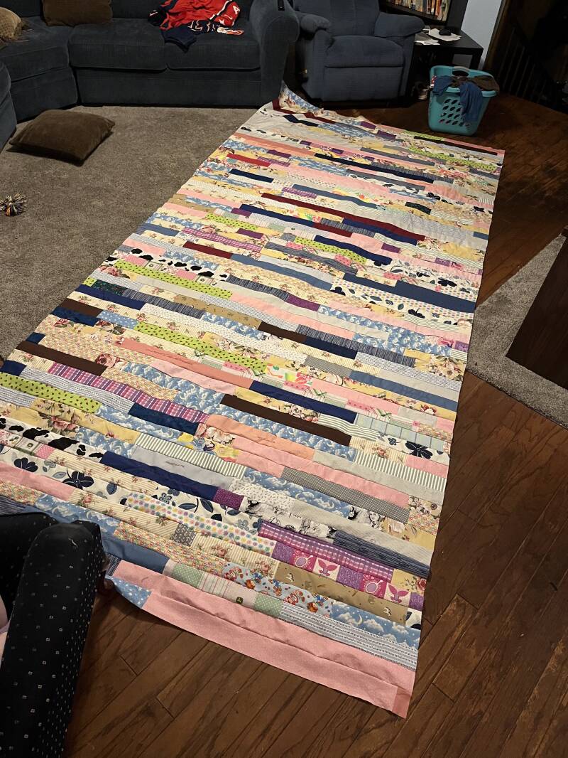 My completely random jelly roll quilt that turned out gigantic! T-shirt quilt with shadows for 3 - D look!